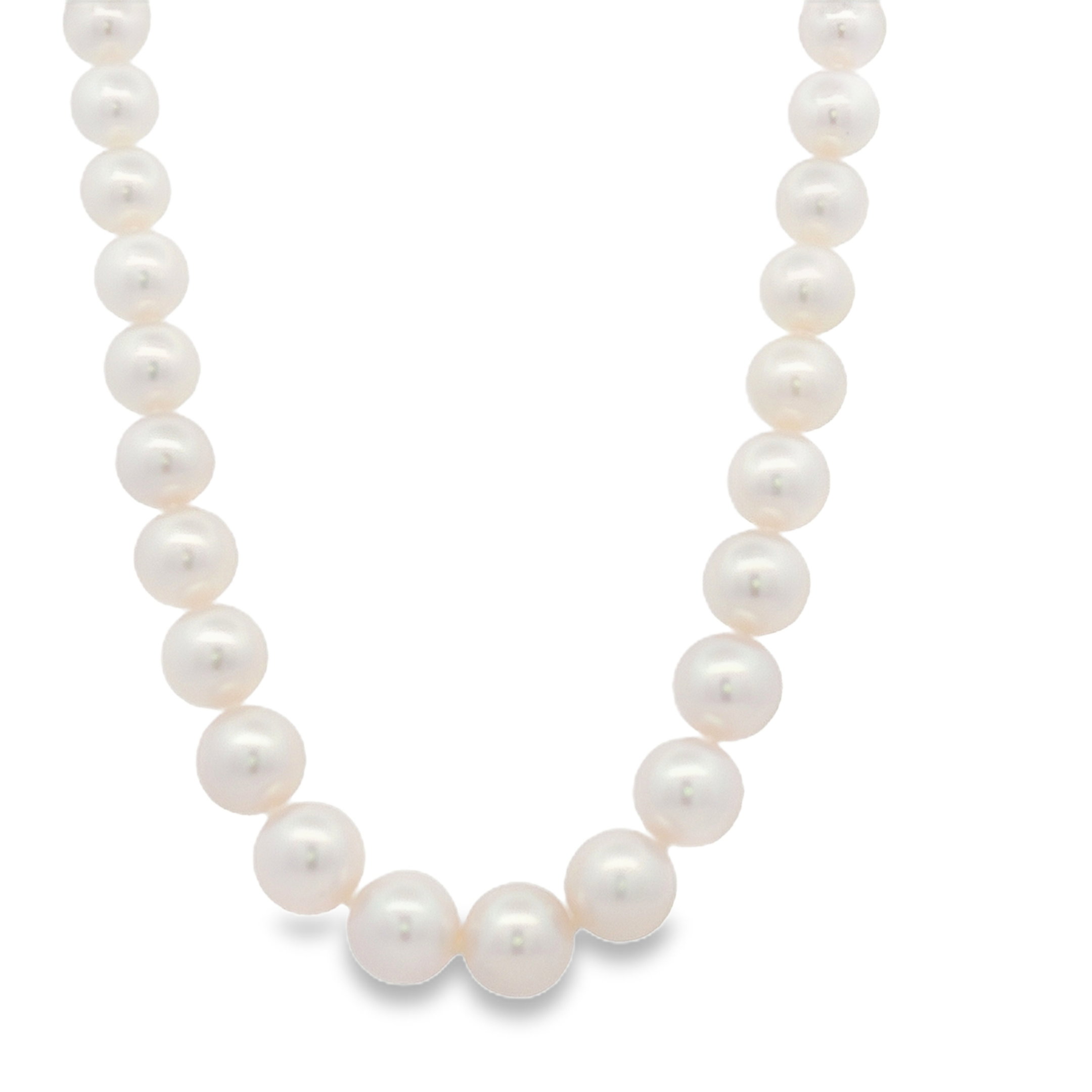 This elegant necklace showcases 49 round white South Sea pearls, graduating from 9.9 to 7.2mm for a refined, balanced look. Finished with a 14K white gold clasp accented by diamonds totaling 0.024ctw, it's a classic piece with a hint of sparkle.-14k White gold-South seas pearl-Diamonds, 0.024ctsItem# 001-325-00154