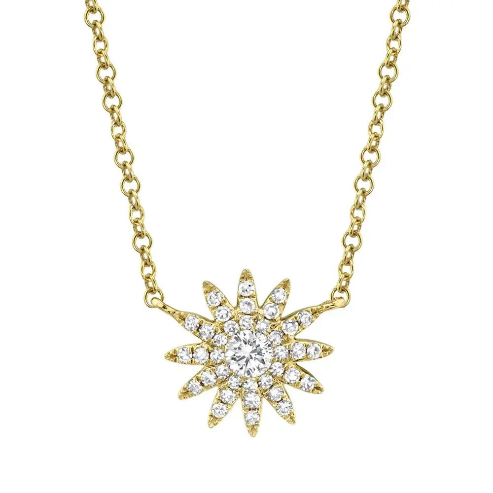 Bring sunshine to cloudiest of days with this dainty sunburst pendant composed of gold and diamonds. Compliment your look with matching earring studs or other layered necklaces. -14k Yellow gold-Round diamonds, 0.15cts-Chain length, 15"-18" on adjustable chainItem# 807-01062