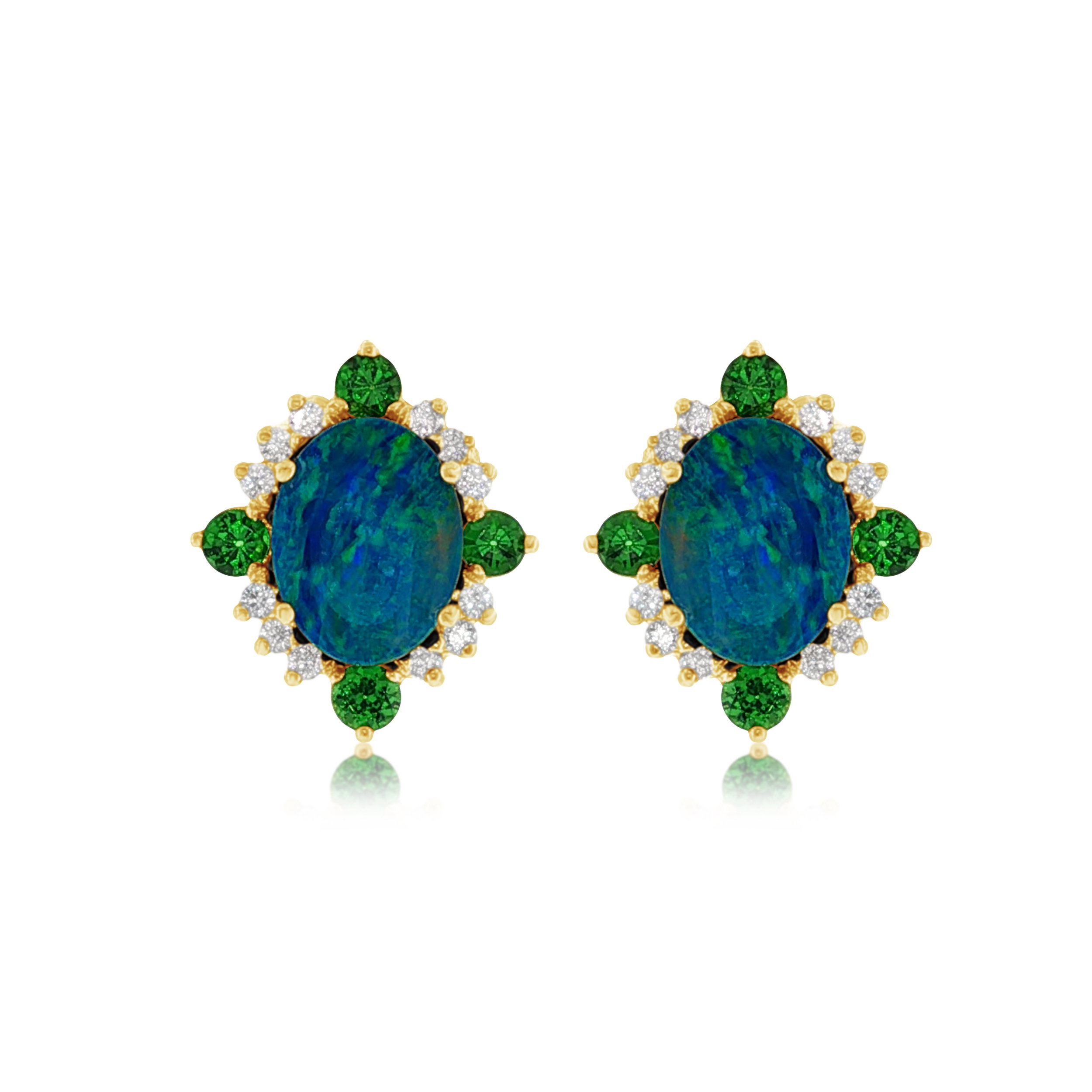 These opal stud earring studs feature vibrant tsavorite garnets, dazzling round diamonds, and mesmerizing boulder opals, all set in 18k yellow gold. A perfect blend of bold color and sparkle, they add a unique, luxurious touch to any ensamble.-18k Yellow gold-Tsavorite Garnets-Boulder Opals-Round diamonds, 0.24ctsItem# 809-00688