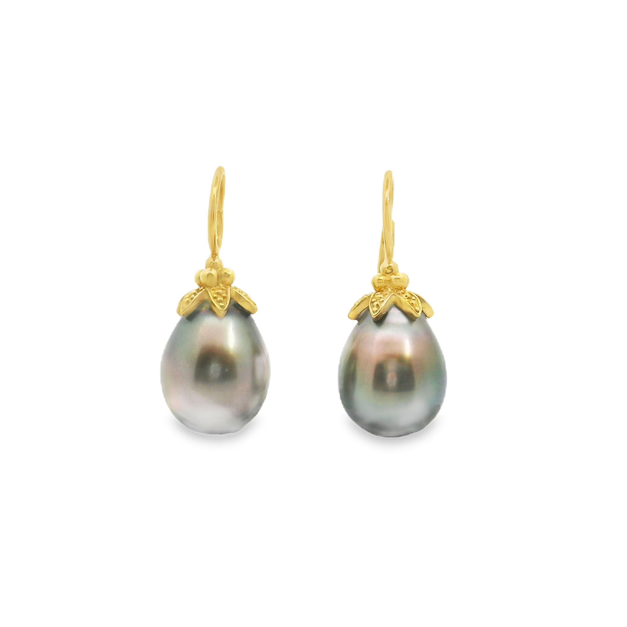 These earrings feature lustrous Tahitian pearls set in 18k yellow gold, offering a stunning contrast between the deep-toned pearls and the warm gold. Their timeless design brings an elegant touch to both everyday wear and special occasions.-18k Yellow gold-Tahitian pearlsItem# 310-00291
