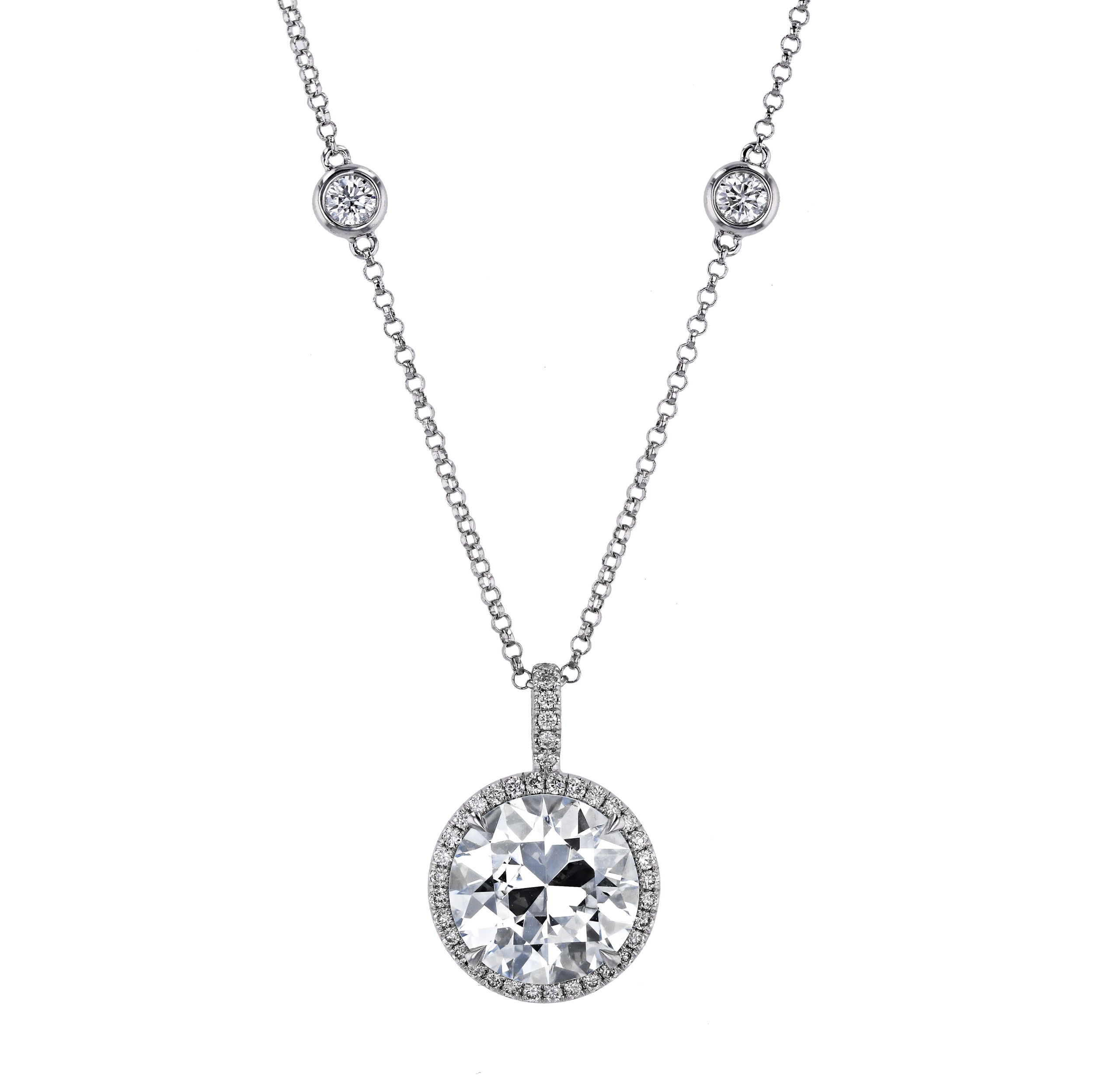 Elevate your style with the timeless elegance of our Diamond Pendant featuring a dazzling micro pavé halo. Expertly set with shimmering accent stones, the center diamond radiates brilliance from every angle. Suspended gracefully from a classic Diamonds By The Yard (DBY) chain, this pendant is the perfect blend of sophistication and modern charm. Ideal for any occasion, it’s a luxurious piece designed to be cherished forever.-18K White gold-Center diamond, 3.01ct-Round diamonds, 0.83ctsItem# 165-2000100
