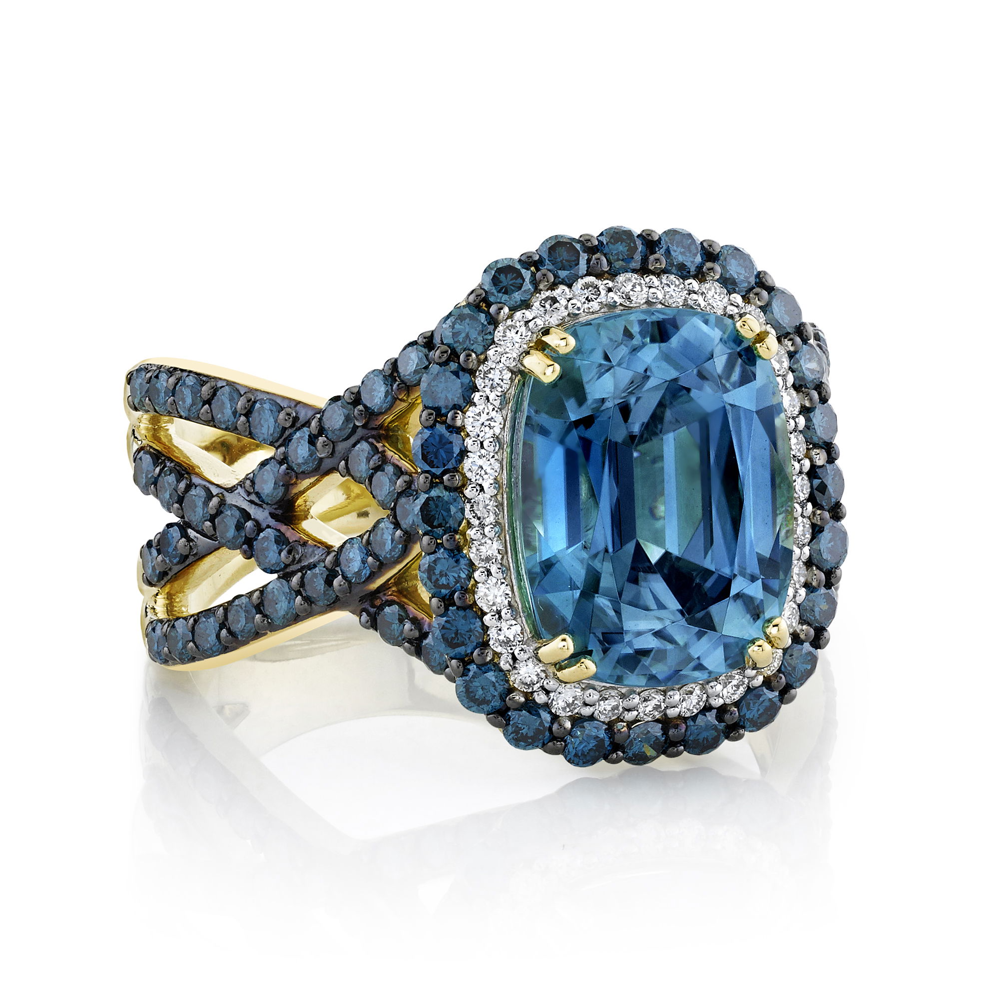 Dare to dazzle with our Blue Zircon Ring, a bold statement of confidence and distinction. A piece made for those who lead, inspire, and stand apart. Wear it as a power piece, and let your presence shine.-18K Yellow gold-Blue zircon, 9.65ct-Blue diamonds, 1.01cts-White diamonds, 0.14ctsContact for sizing optionsItem# 200-2000204