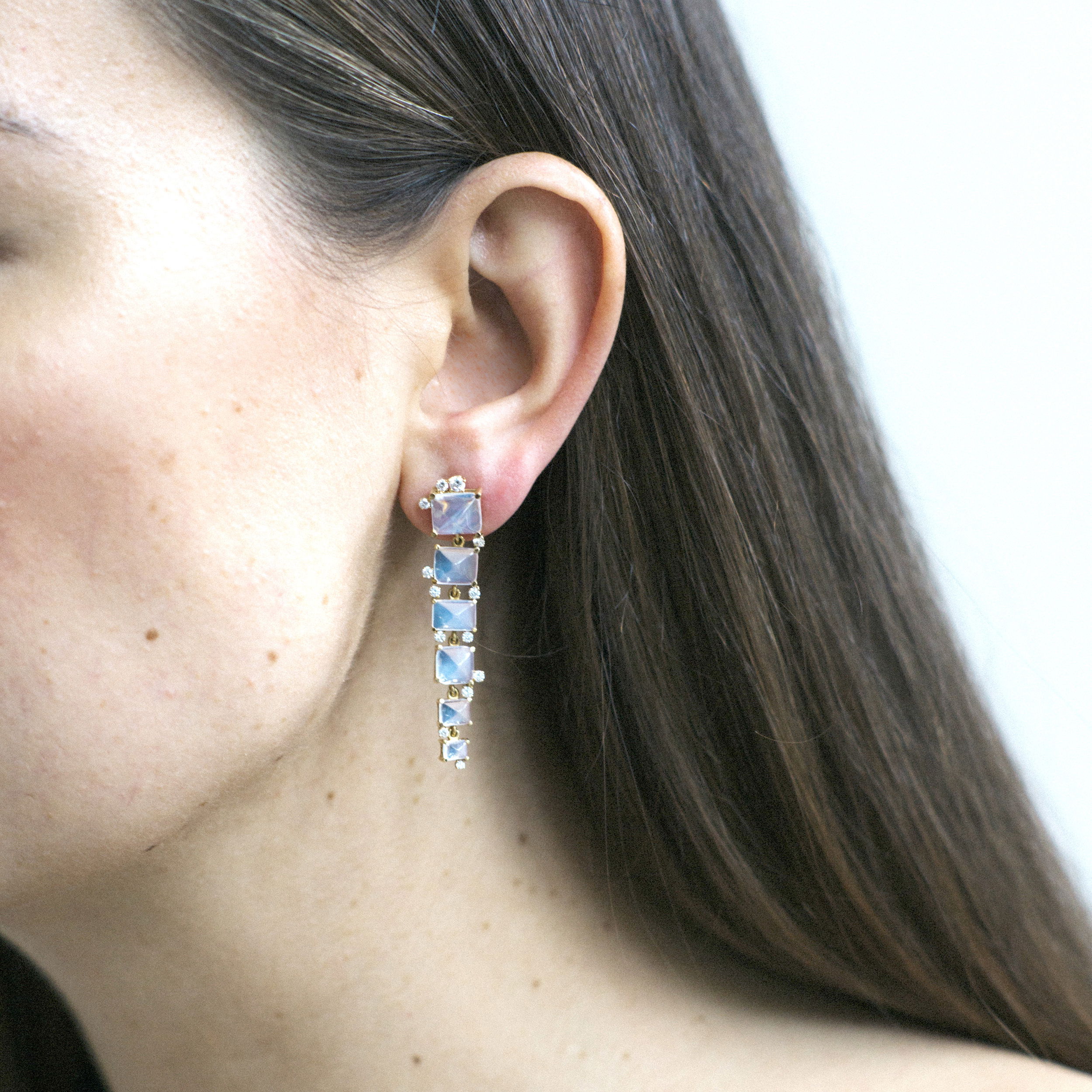 Unleash your cosmic spirit with the "Rock N Roll" Moon Quartz Sugarloaf Drop Earrings. Elevate your look with an accessory as rare and magical as a moonlit reverie.-18K Yellow gold-Moon Quartz, 10.44cts-Diamonds, 0.64ctsItem# 210-2000125