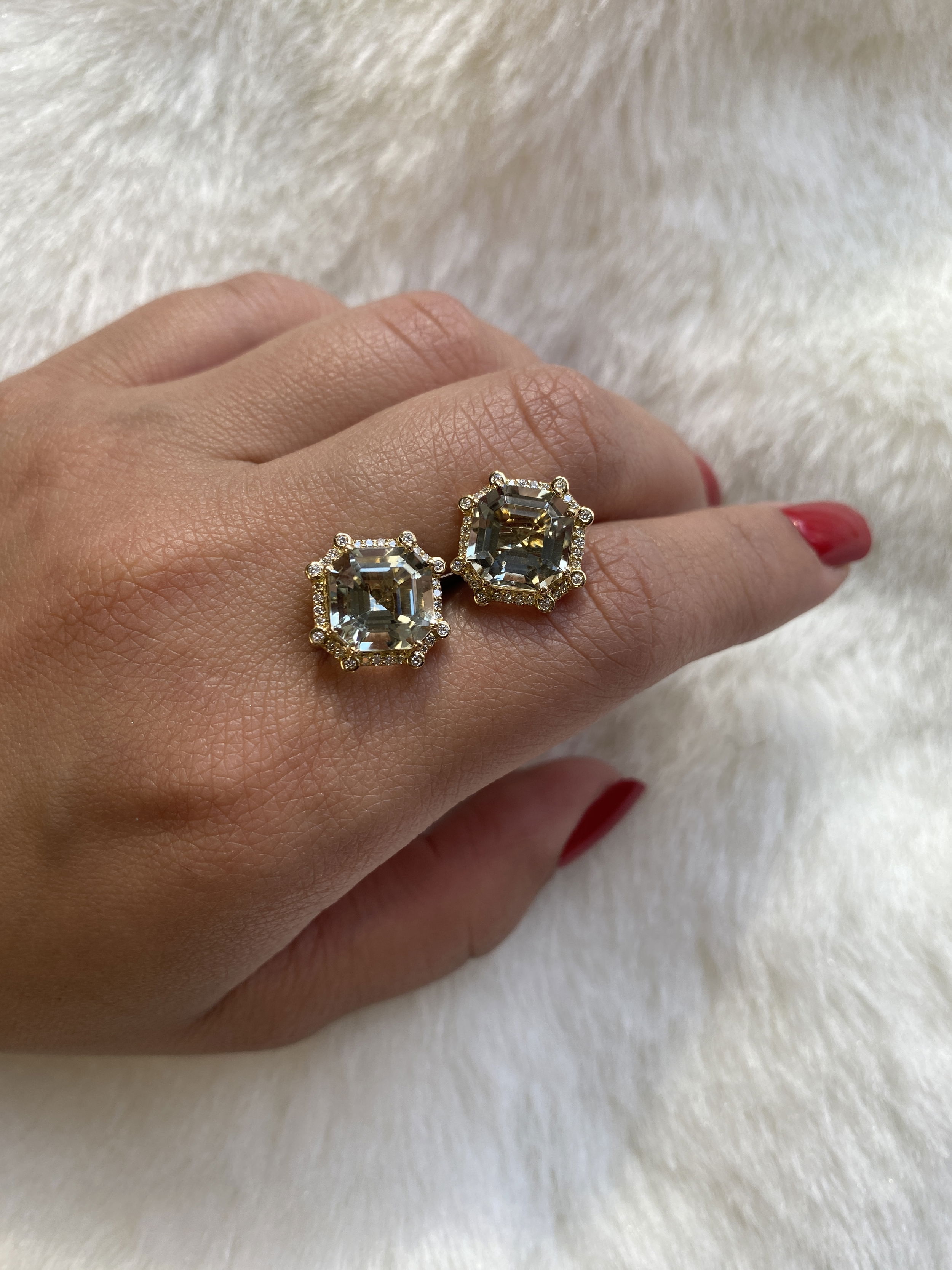 Add to your collection with our 'Gossip' Prasiolite Asscher Cut Stud Earrings—a captivating blend of bold geometry and vibrant color. Light-catching and effortless, the 'Gossip' earrings are perfect for elevating everyday ensembles or making a subtle statement at special occasions.-18K Yellow gold-Prasiolite, 5.99cts-Diamonds, 0.3ctsItem# 210-2000126