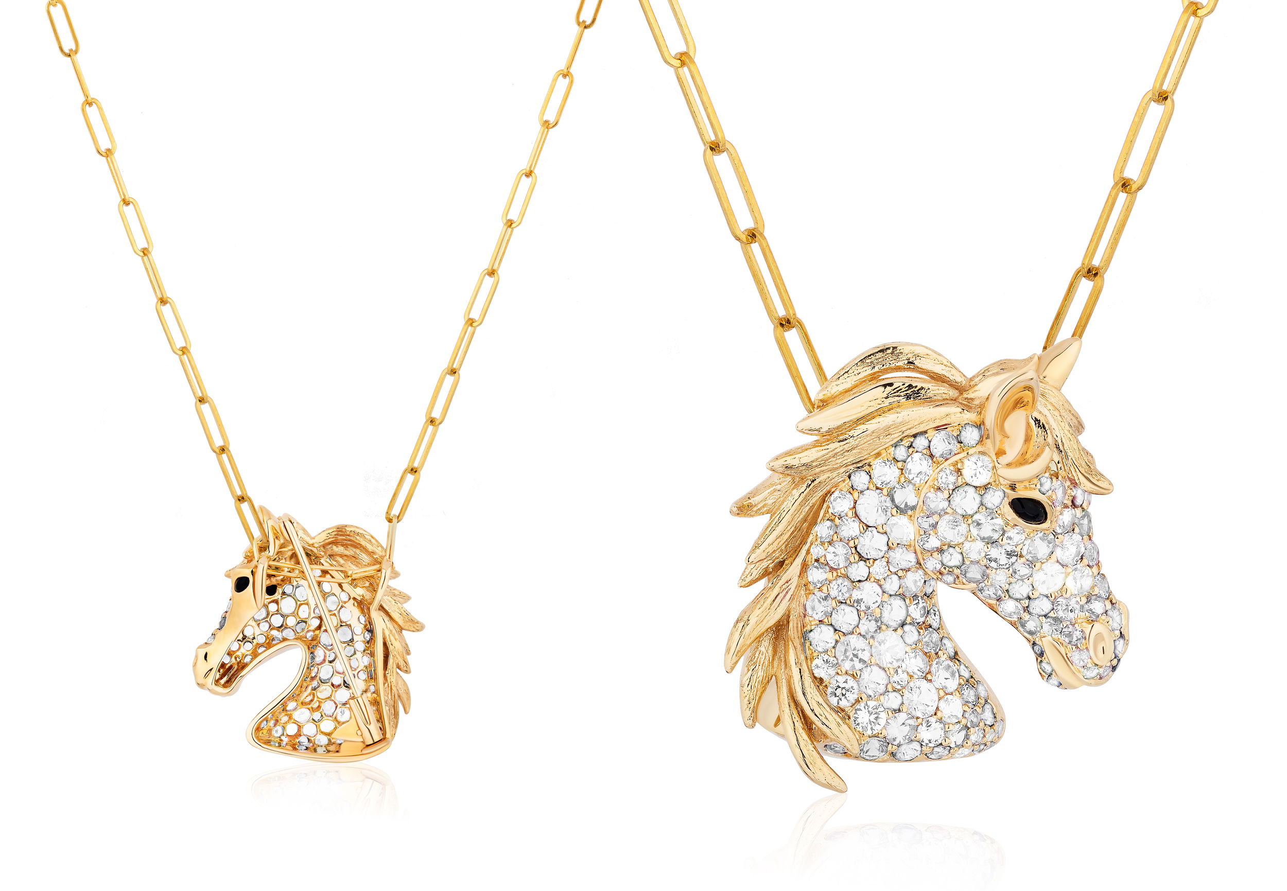 Add a touch of equestrian elegance to your look with the Ark Collection Horse Pendant or Brooch. Finished in lustrous metal with fine detailing, this piece is perfect for horse lovers and style enthusiasts alike, making it a cherished gift or a striking personal keepsake.-18K Yellow gold-White sapphires, 3.54cts-Onyx, 0.1ct-Length, 18"Item# 230-2000025