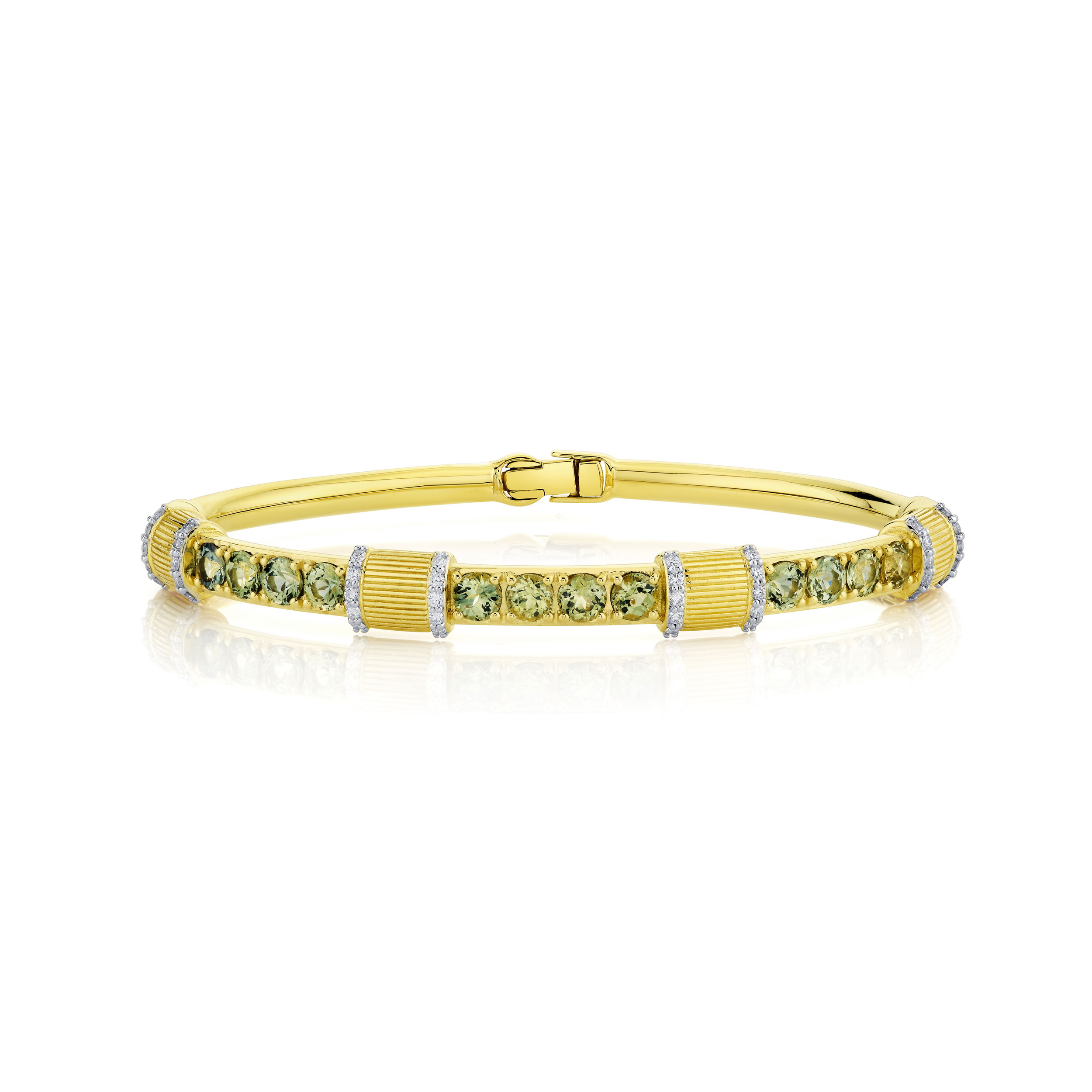 Elevate your collection with this striking Green Sapphire and Diamond Bracelet, adorned with distinctive strie detailing. Perfect for adding a dash of luxury to your everyday style, this bracelet embodies timeless beauty and refined craftsmanship.-18K Yellow gold-Green sapphires, 3.71cts-Round diamonds, 0.4ctsItem# 240-2000045