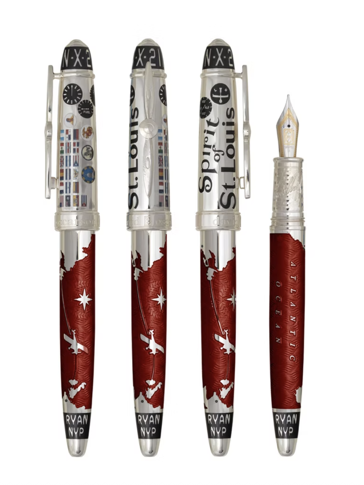 The David Oscarson Spirit of St. Louis fountain pen, presented here in the striking red finish and individually numbered 8 of only 70 pieces, celebrates the daring legacy of Charles Lindbergh’s historic transatlantic flight. Meticulously crafted in guilloché and hot enamel, it blends aviation-inspired artistry with exceptional writing performance for collectors who value both heritage and craftsmanship.-Sterling silver-EnamelItem# 750-2000034