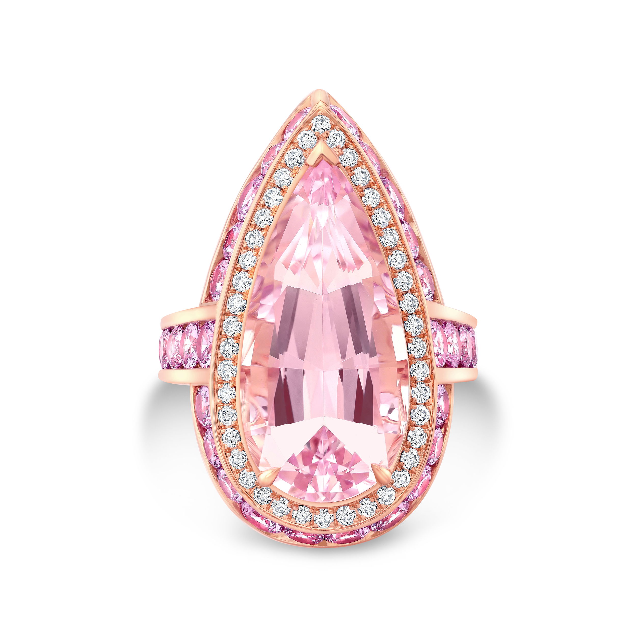 Crafted in 18k red gold, this ring showcases an 11.27ct pear-shaped morganite surrounded by a sparkling halo of pink sapphires and diamonds- a striking yet feminine piece designed to make a lasting impression. -18k Red gold-Morganite, 11.27ct-Pink sapphires, 4.5cts-Diamonds, 0.51cts-Size 8, contact for sizing options. Item# 804-2000456