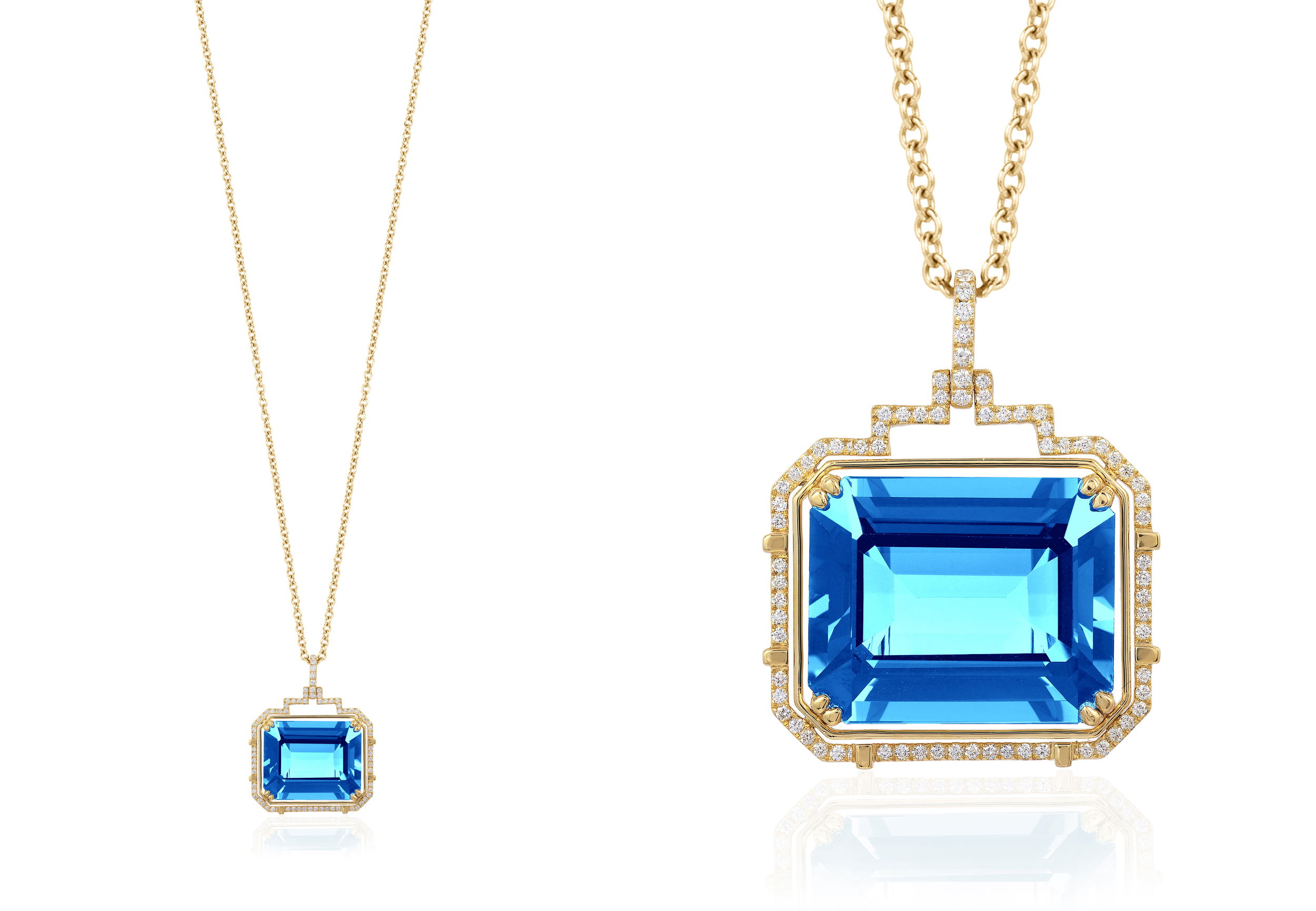 Make a stylish impression with the ‘Gossip’ Blue Topaz Emerald Cut Pendant—a captivating statement piece designed to turn heads. Whether layered or worn solo, the ‘Gossip’ pendant is your go-to accessory for unforgettable moments and endless compliments.-18K Yellow gold-Blue topaz, 60.27ct-Round diamonds, 0.68cts-Length, 24"Item# 806-2000217