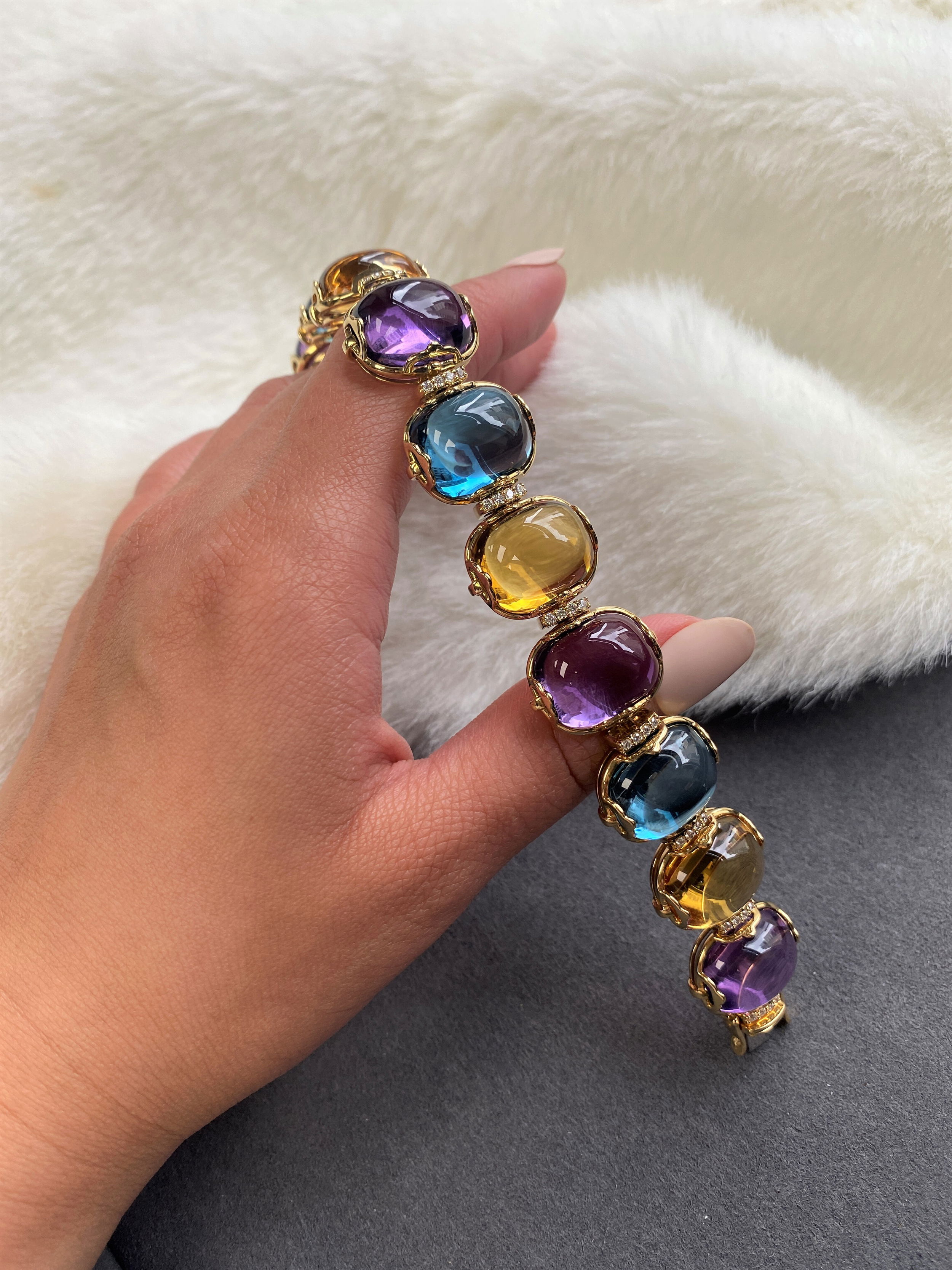 Unleash your boldest self with this bracelet—a dazzling symphony of luminous diamonds and a vibrant arrangement of colored gemstones. This statement piece embodies both edgy elegance and timeless luxury, layering a cascade of color and sparkle around your wrist. Meticulously crafted for the true icon, this is your ticket to stand out, exuding confidence and contemporary flair with every movement.-18k Yellow gold-Round diamonds, 0.54cts-Citrine, 53.06cts-Amethyst, 51.891cts-London blue topaz, 51.03ctsItem# 808-2000380