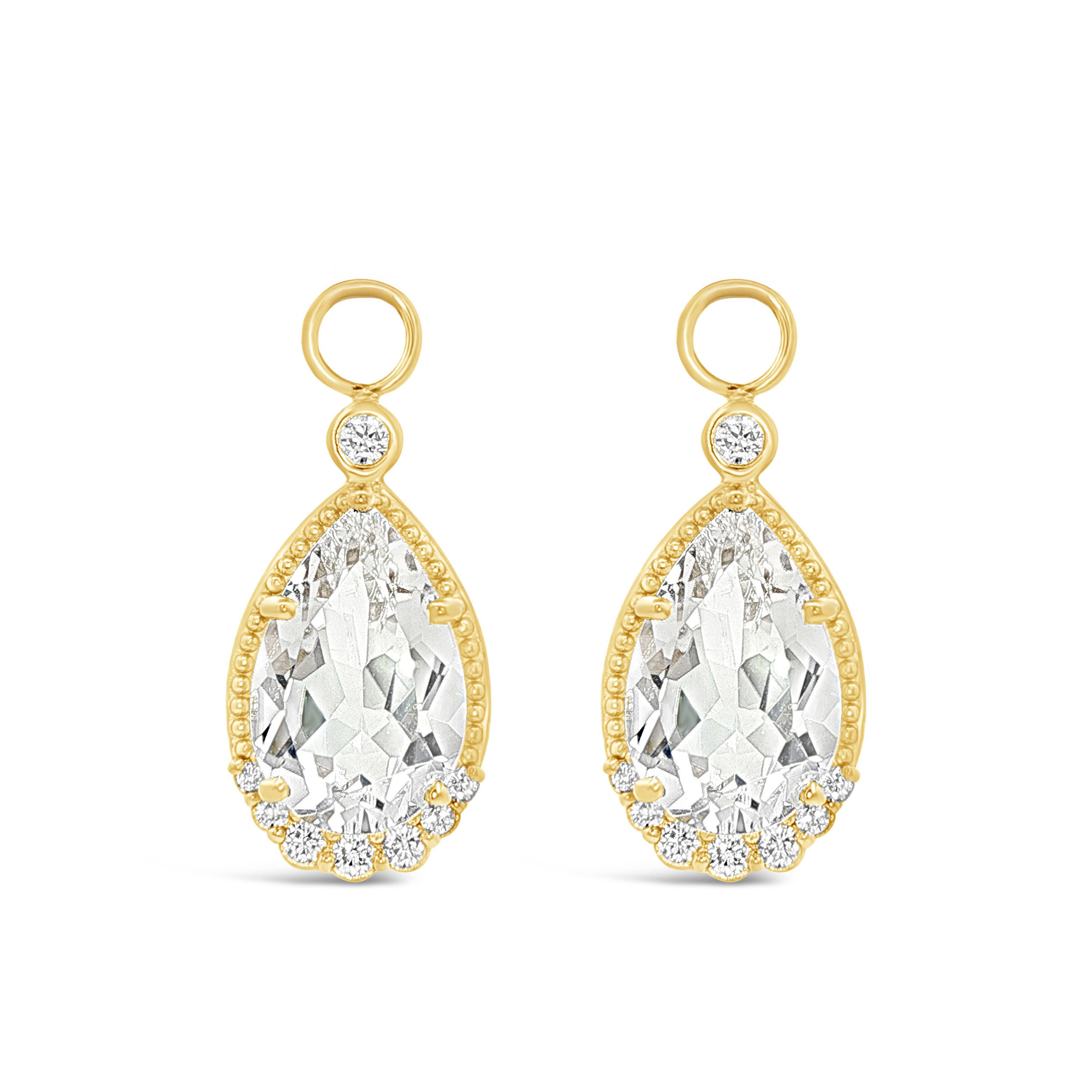 These beautiful white topaz earrings are complimented by sparkling diamonds and warm 18k yellow gold. A beautiful statement that can be worn from day to night.-18k Yellow gold-White topaz-Diamonds, 0.38ctsItem# ND-EAR-00065