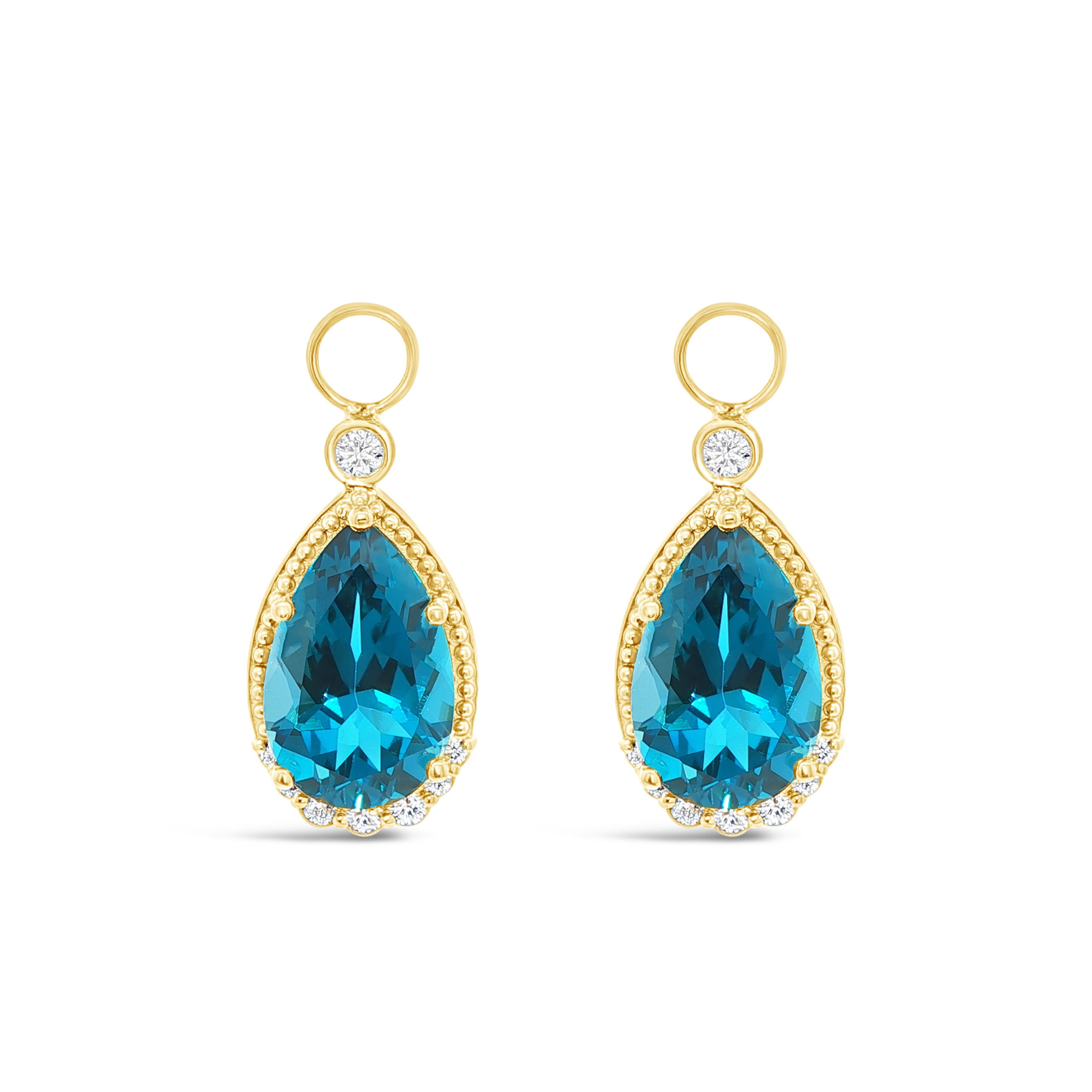 These deep blue topaz and diamond earring charms in 18k yellow gold will add a beautiful pop of color to any outfit. Perfect for a timeless gift or treat for yourself! Hoops sold separately. -18k Yellow gold-Blue topaz-Diamonds, 0.38ctsItem# ND-EAR-00049