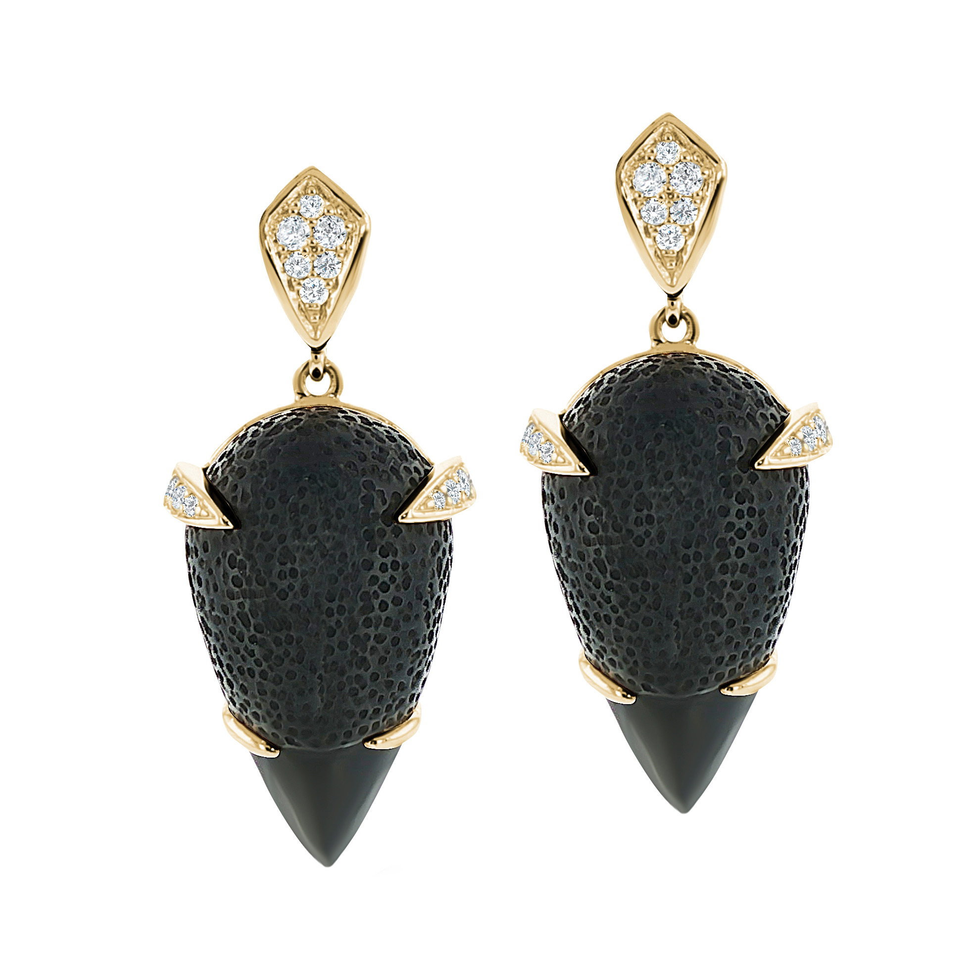 Carved jet stones paired with shimmering diamonds and rich 18k yellow gold create a bold, high-contrast look that feels effortlessly cool. Easy to dress up or down, they bring just the right edge to any look from day to night.-18k Yellow gold-Carved Jet-Diamonds, 0.19ctsItem# ND-EAR-00078