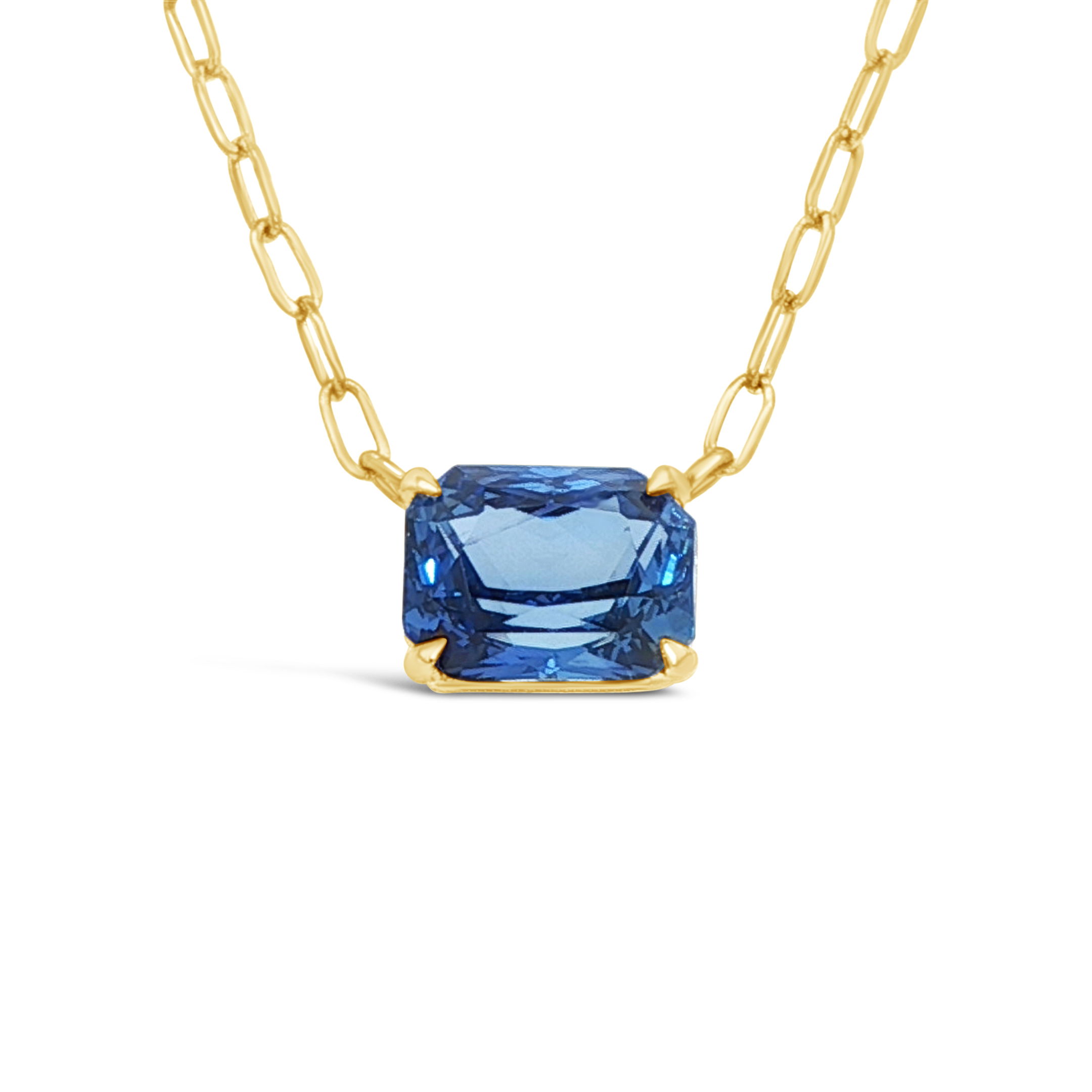 A rich blue sapphire pendant hangs from a 14k yellow gold paperclip chain. Easy to wear on its own or layered, it adds a confident pop of color that works from everyday errands to dressed-up evenings.-14k Yellow gold-Blue Sapphire, 1.60ctItem# ND-NK-00060