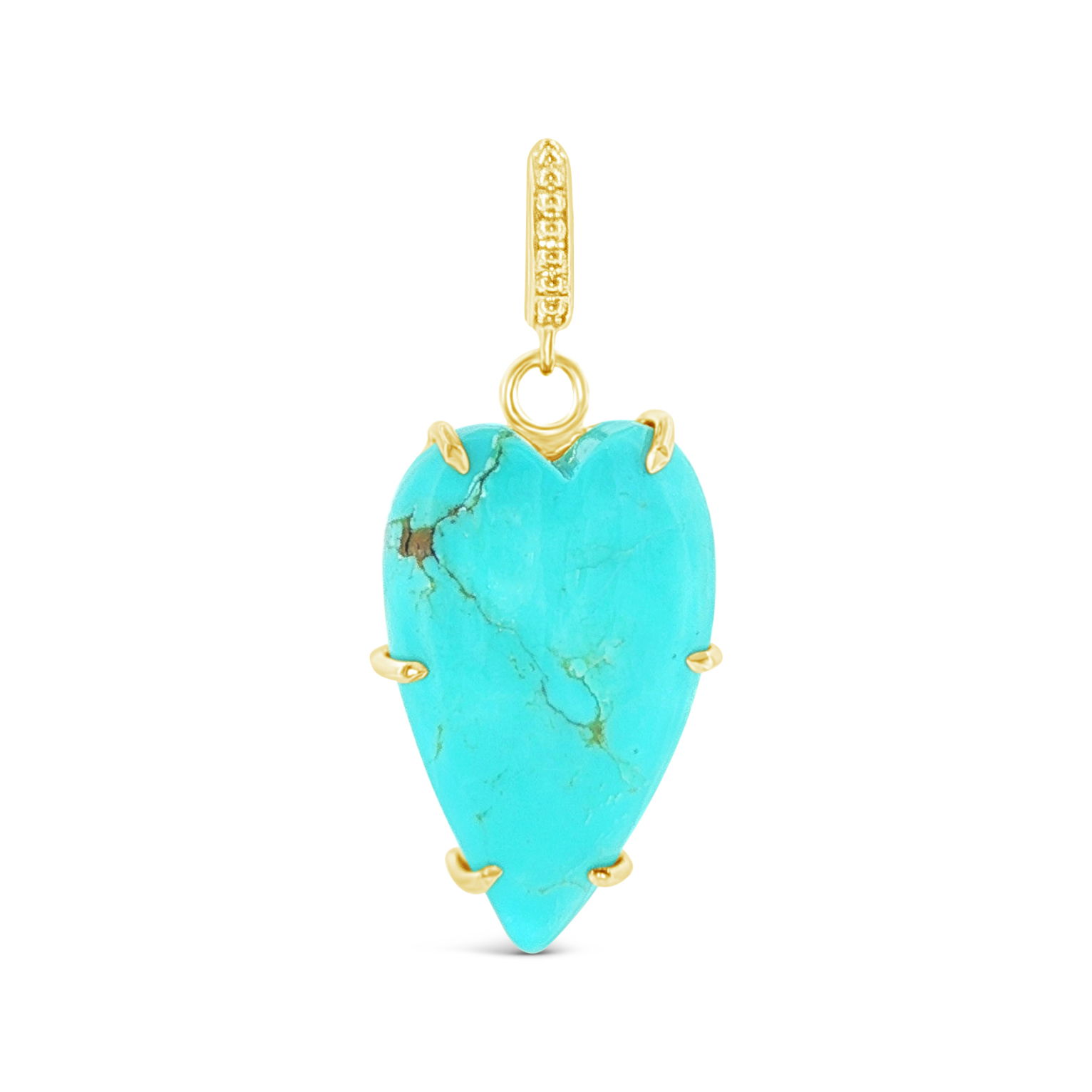 Capture a touch of serenity with this beautiful turquoise heart pendant, set in 18k yellow gold. It’s a thoughtful gift for someone you cherish, or a beautiful indulgence for yourself. (Chain sold separately.)-18k Yellow gold-Turquoise heartItem# ND-PD-00025