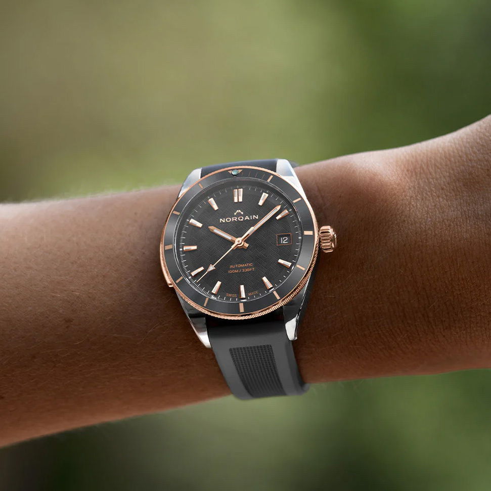 Adventure Sport Grey Ceramic/Gold Bezel Grey Dial Grey Rubber Strap37mmThe Adventure line embodies the thrill of exploring and conquering nature’s playground – the trails, the summits and the tides.Item# time-00161