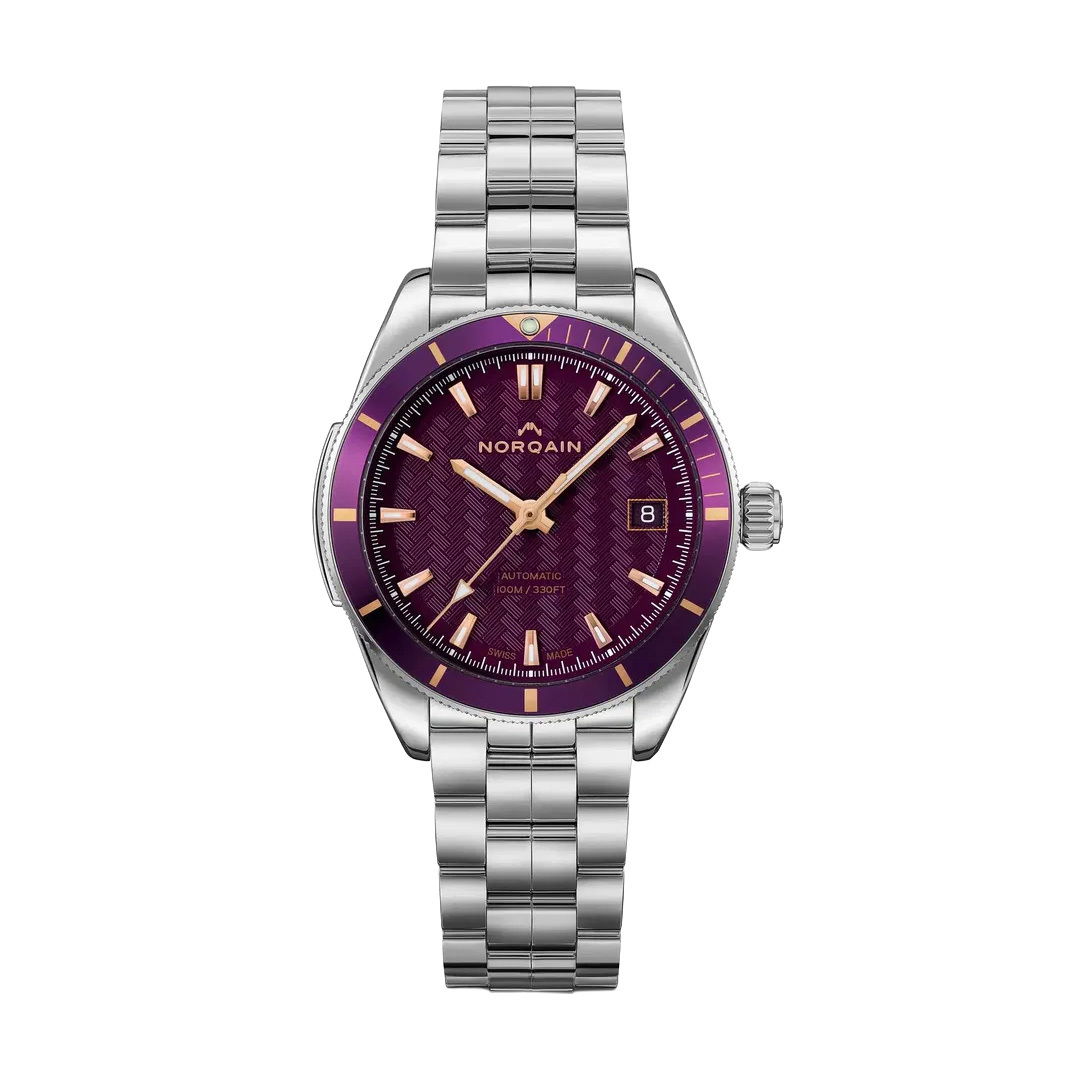 Adventure Sport Aluminium Bezel Purple Dial Steel Bracelet37mm The Adventure line embodies the thrill of exploring and conquering nature’s playground – the trails, the summits and the tides.Item# time-00163