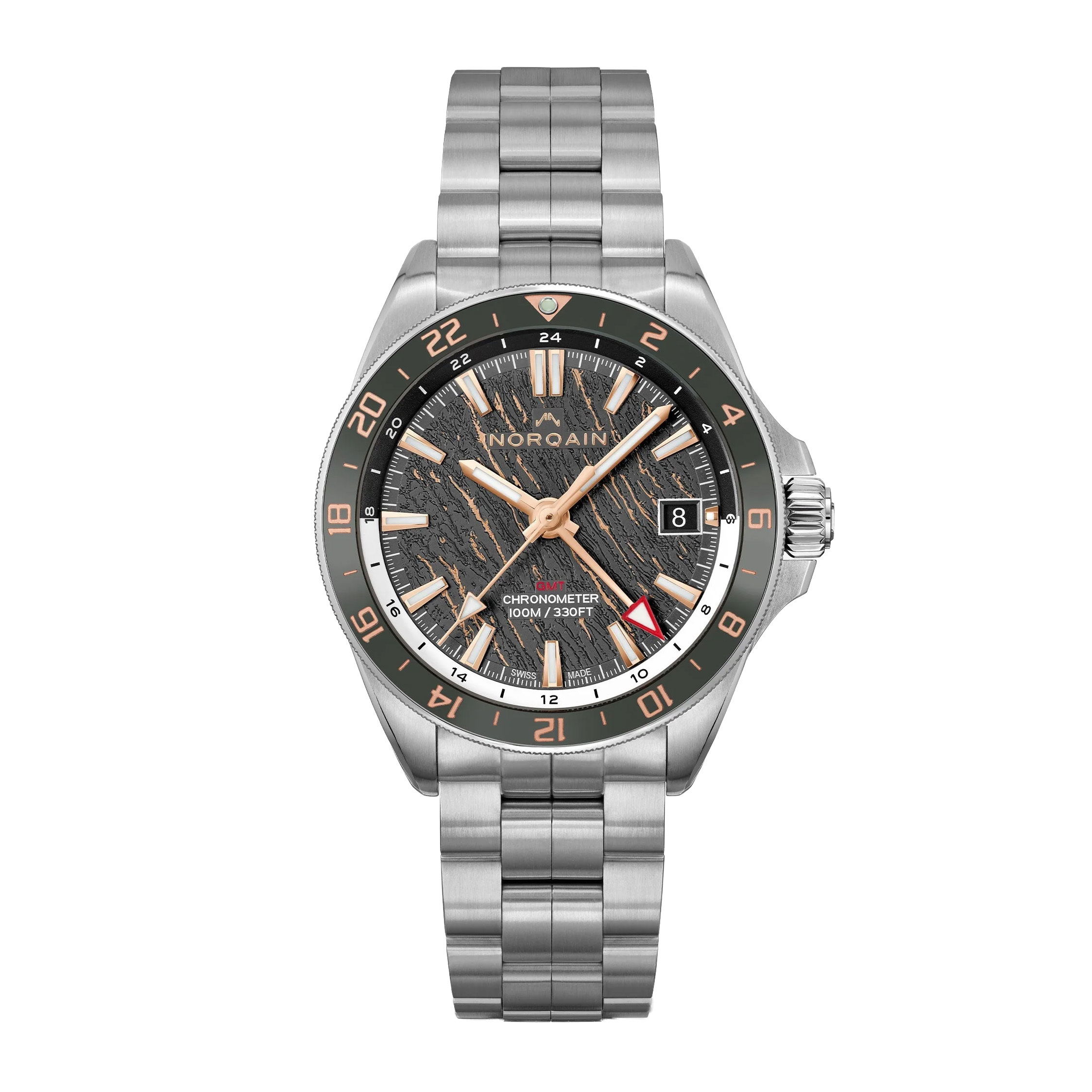 Adventure NEVEREST GMT 41mm Steel Bezel Grey Ceramic Ring Grey&5N Glacier Dial Steel Bracelet41MMSN: 39574The Adventure NEVEREST collection is a line that represents NORQAIN’s ambitious drive, passion for new challenges and never-resting spirit. These timepieces are stylish and rugged. With the brand’s partnership with the Butterfly Help Project, ten per cent of the earnings from the sales of Adventure NEVEREST watches help families of Sherpas who have lost their lives in the Himalayan mountains and give their children access to education.Item# time-00169
