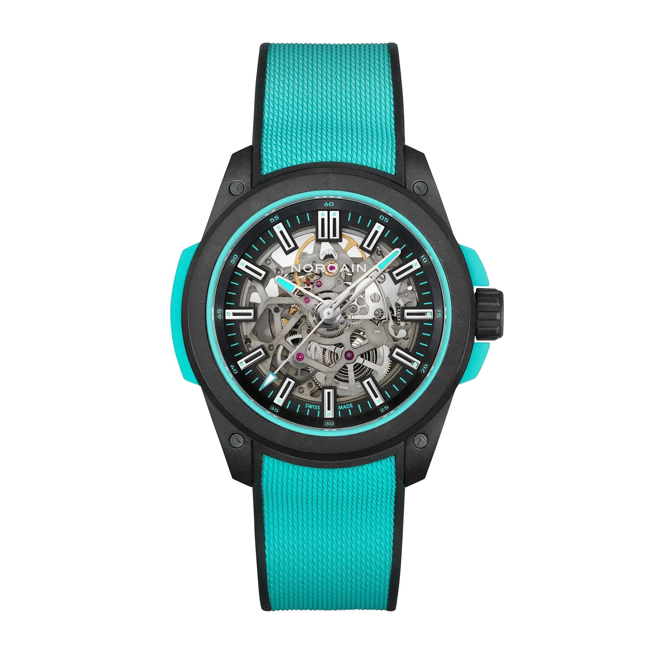 Wild ONE Skeleton Turquoise 42mm Black dial Black & Turquoise rubber strap Black buckle42MMThe NORQAIN Independence Wild ONE, made with NORQAINS proprietary NORTEQ carbon fibre material, is the ultimate sports watch. Six times lighter than Steel and 3.5 times lighter than titanium with water resistance to a depth of 200 metres, it is robust enough for virtually any activity on land or water. The Wild ONE has been designed in collaboration with Jean-Claude Biver, the NORQAIN team and the best Swiss suppliers.Item# time-00182