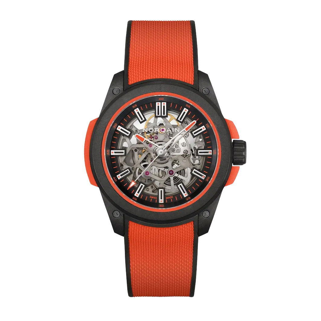 Wild ONE Skeleton Coral Red 42mm Black Dial Coral Red Rubber Strap42MMThe NORQAIN Independence Wild ONE, made with NORQAINS proprietary NORTEQ carbon fibre material, is the ultimate sports watch. Six times lighter than Steel and 3.5 times lighter than titanium with water resistance to a depth of 200 metres, it is robust enough for virtually any activity on land or water. The Wild ONE has been designed in collaboration with Jean-Claude Biver, the NORQAIN team and the best Swiss suppliers.Item# time-00183