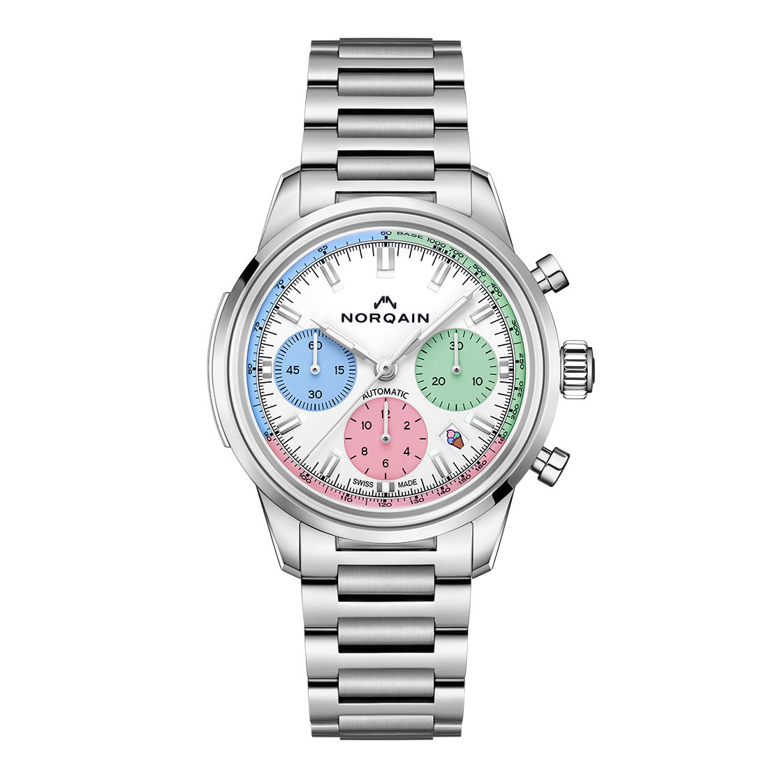 The Freedom 60 Chrono 40mm Enjoy Life Special Edition – a scoop of summer on your wrist. Bursting with vibrant colours, this timepiece channels the carefree spirit of the season. Playful ice cream illustration and the uplifting “Enjoy Life” motto make it the perfect companion for sunny days. A joyful tribute to colour, fun, and freedom.NORQAIN Founder and CEO Ben Küffer said: "The “Enjoy Life” Special Edition is a tribute to the kid in all of us. That little ice cream in the date window is more than a playful detail; it’s a reminder to take life a little less seriously, enjoy the ride, and keep that playful spirit alive. Whether it brings back memories of your own childhood or reflects the laughter of your kids today, the “Enjoy Life” captures that pure, feel-good energy."-Strap: Steel FreedomItem# time-00189