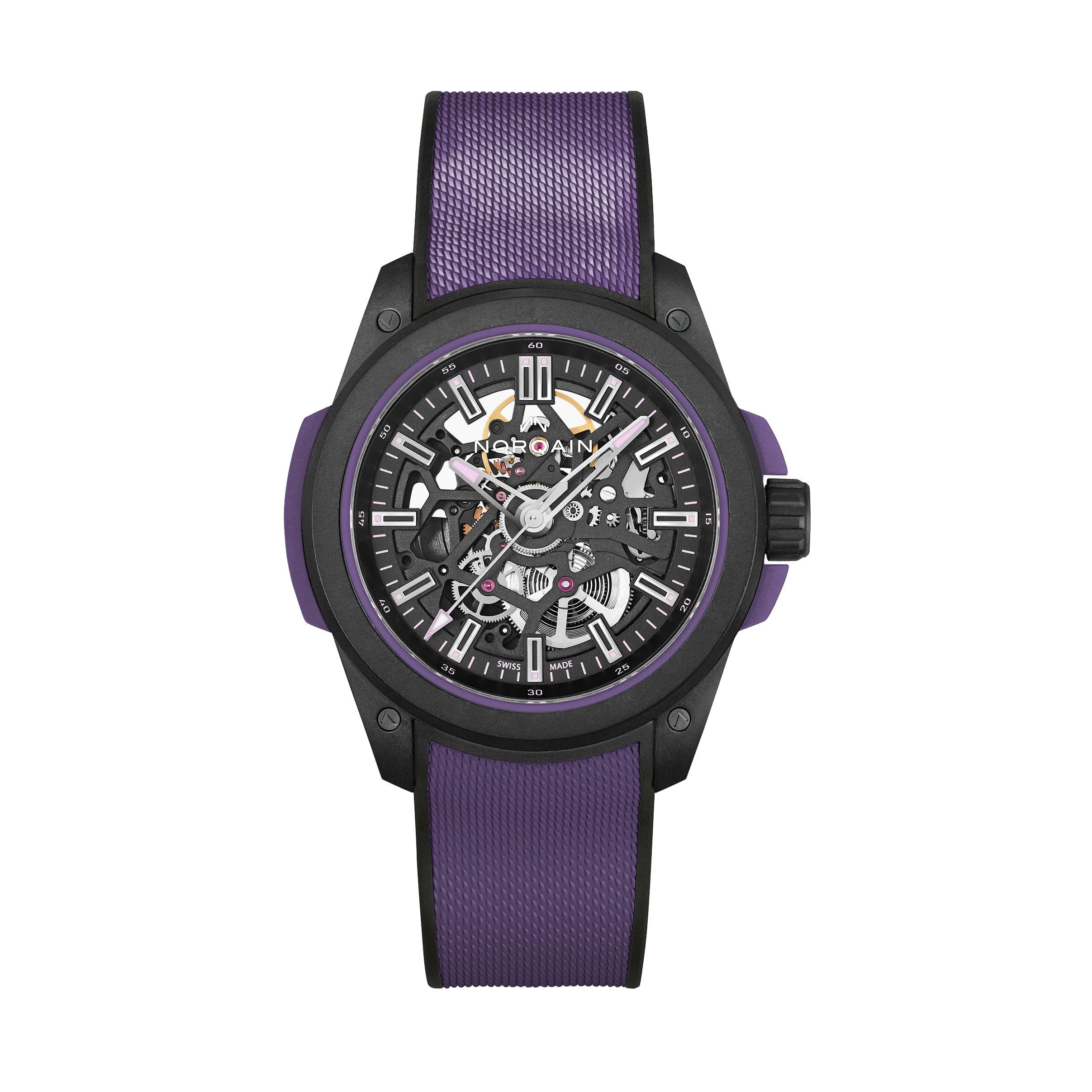 The Wild ONE 42mm, crafted from our proprietary ultra-light and ultra-robust NORTEQ® carbon fibre, is the ultimate high-performance sports watch. Powered by a mechanical automatic skeleton movement, it reveals the intricate craftsmanship and precision engineering at its core. This timepiece is limited to only 400 pieces.-Strap: Purple Mesh RubberItem# time-00200