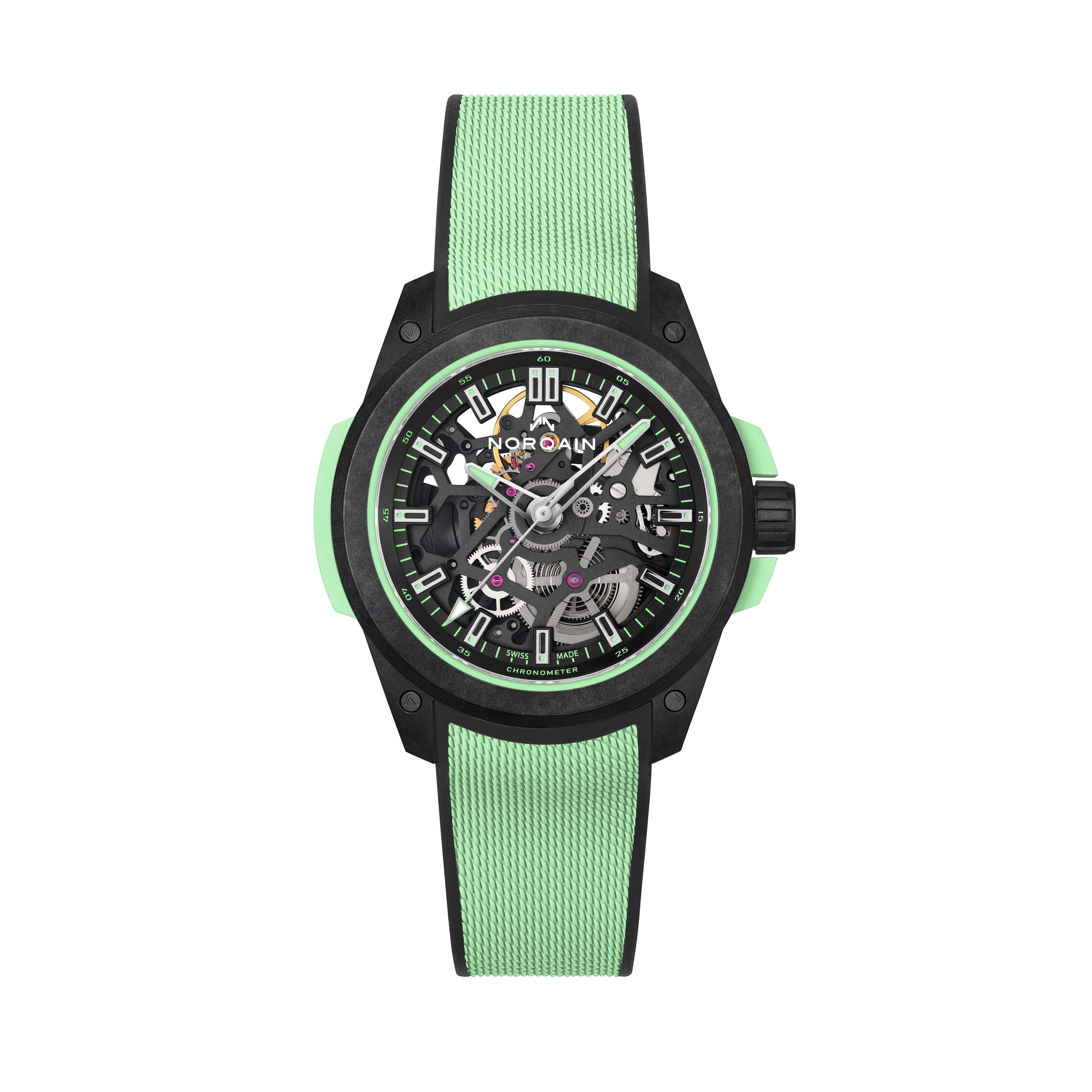 The Wild ONE 39mm, crafted from our proprietary ultra-light and ultra-robust NORTEQ® carbon fibre, is the ultimate high-performance sports watch. Powered by a mechanical automatic skeleton movement, it reveals the intricate craftsmanship and precision engineering at its core. This timepiece is limited to only 400 pieces.Item# time-00217