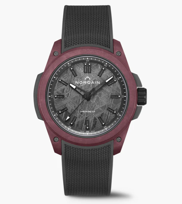 Wild ONE 42mm Special Edition Meteorite Dial Burgundy 42MMThe NORQAIN Independence Wild ONE, made with NORQAINS proprietary NORTEQ carbon fibre material, is the ultimate sports watch. Six times lighter than Steel and 3.5 times lighter than titanium with water resistance to a depth of 200 metres, it is robust enough for virtually any activity on land or water. The Wild ONE has been designed in collaboration with Jean-Claude Biver, the NORQAIN team and the best Swiss suppliers.Item# time-00222