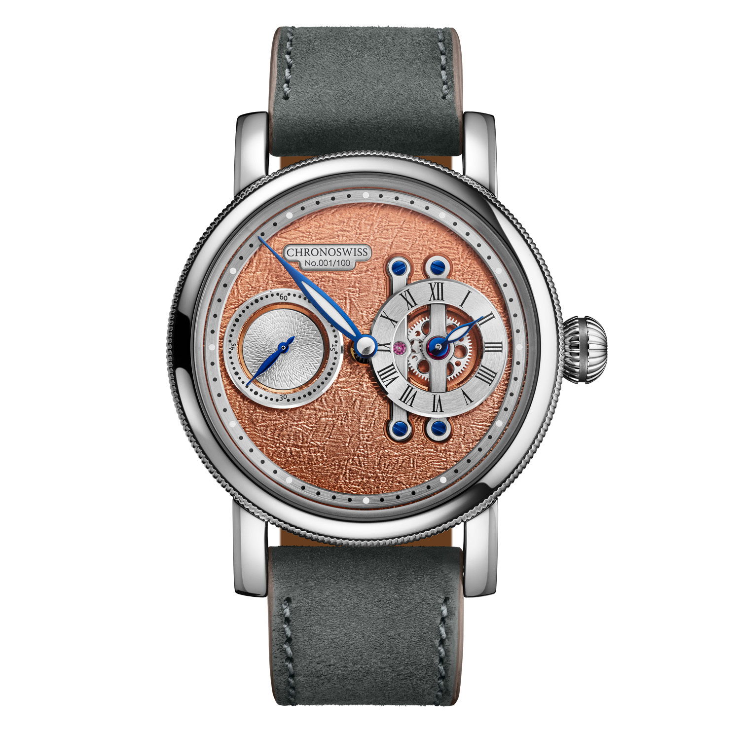 3 ATMThe rugged beauty of Earth's terrains, captured in a sleek 40mm stainless steel case. Limited to just 100 pieces, the brown PVD-coated, lasered dial of the Terra echoes the essence of nature’s raw landscapes, creating a tactile experience on the wrist. The unique horizontal regulator setup, powered by the Manufacture Caliber C.6000, is a true testament to the artistry and innovation of Chronoswiss. Nature, distilled in steel. The Terra brings raw landscapes to life through texture, tone, and mechanical complexity.-Water resistance: 30M / 3 ATM-Power reserve: 55 H-Diameter: 40 mmItem# time-00225