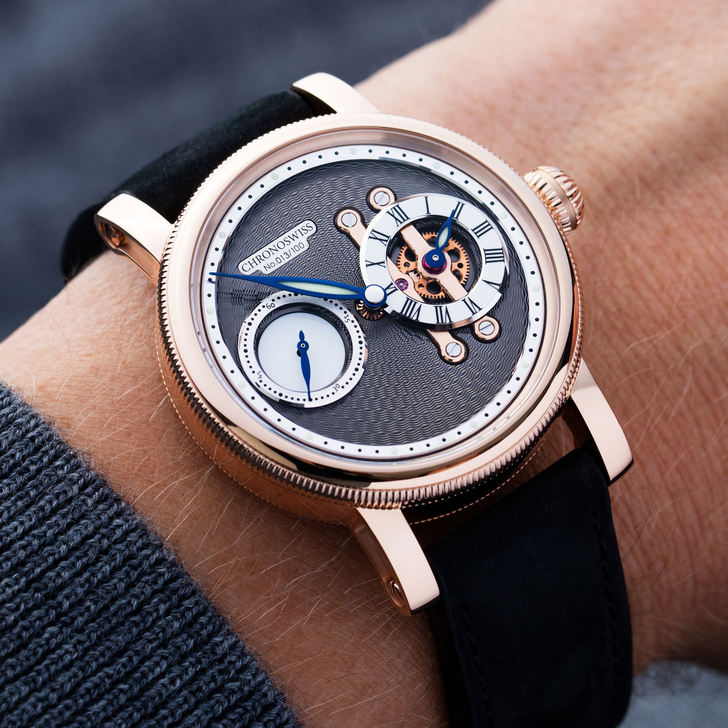 Hidden deep in the mechanical wilderness lies a discovery forged in pure gold: the Chronoswiss Strike Two Nugget. Crafted from solid 18ct red gold, its anthracite guilloché dial and white lacquered subdial reflect contrast, refinement, and rarity. With its horizontal regulator architecture and exposed bridges, the Nugget is powered by the Manufacture Caliber C.6000 and limited to 100 pieces — a timepiece born from the pursuit of the extraordinary. Refined. Rare. Untamed. The Strike Two Nugget unites solid gold with mechanical depth - built for those who seek the extraordinary.-Water resistance: 30 M / 3 ATM-Diameter: 40 mm-Power reserve: 55 HItem# time-00227